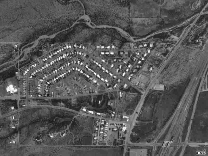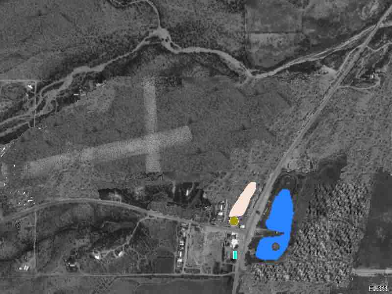 This picture is a fake--JASC's Paint Shop Pro was used to erase the present day details at Kinsley Ranch (Arivaca Junction). You can "see" the pool (turquoise), dance hall (yellow), the rodeo arena(tan), the lake (blue) and a representation of the airport. When you click on the picture you see the USGS original with the freeway and housing. Similar transformations have taken place all along the valley.